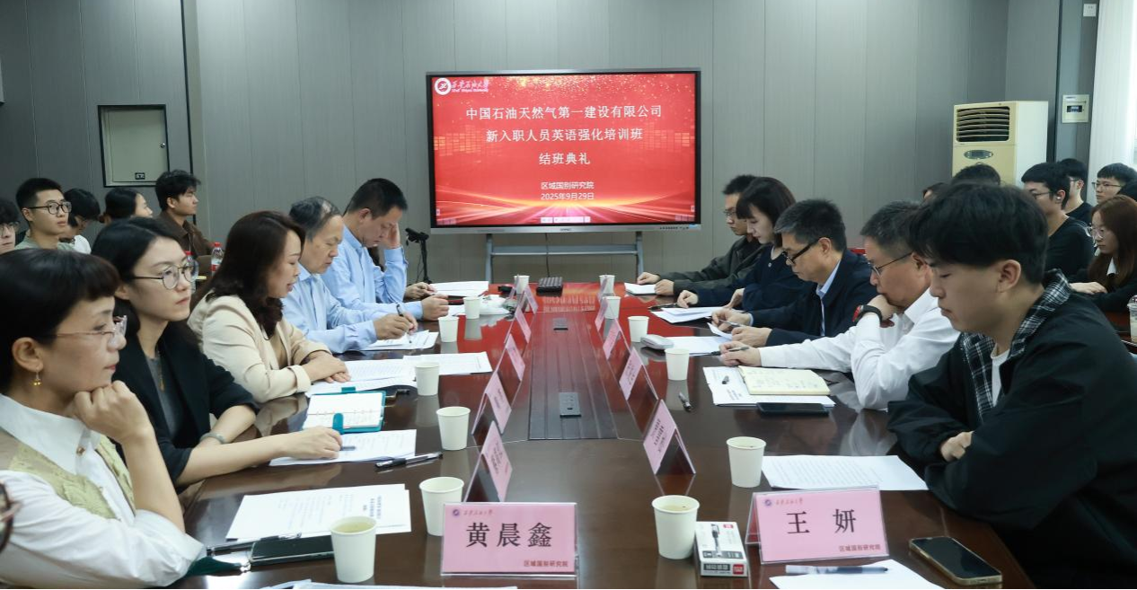 9月29日下午,区域国别研究院在雁塔校区东方石油楼4-04会议室举办了中国石油天然气第一建设有限公司新入职人员国际化能力培训班结业典礼。中国石油天然气第一建设有限公司总经理助理刘明国、总经理助理兼国际事业部经理张俊生、国际事业部培训主管池凝、区域国别研究院执行院长刘辉、培训班部分任课教师和全体学员参加了结业典礼,结业典礼由区域国别研究院办公室副主任陶李主持。