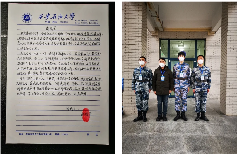 在结束让人内心震撼的元旦升旗的旗手任务之后,张峻宇继续奔赴学校一线,参与了由退伍大学生组成的“学生疫情防控纠察队”,不知疲倦地奉献着自己。“我们要对得起身上的这身礼服,对得起自己宣誓的那面国旗,对得起自己‘护我国旗,壮我国威’的誓言。”有了这誓言,天再冷,病毒再可怕,我们都始终相信,西石大必胜,西安必胜。